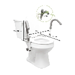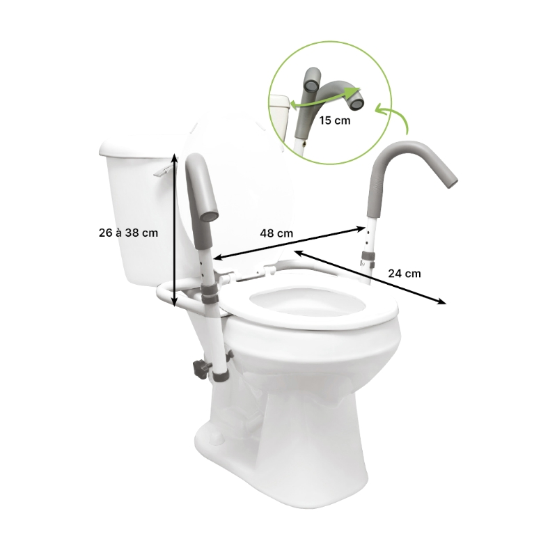 Dimensions : larg. 48 x prof. 24 cm. Hauteur des accoudoirs par rapport à la cuvette 26 à 38 cm en 6 positions. Entraxe 15 cm.