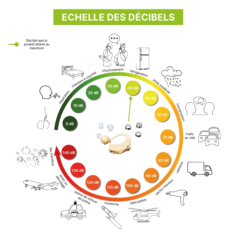 qui vous permet d’amplifier les sons de votre entourage. Appareil confortable et discret à positionner simplement derrière l’oreille. amplification max 40dB avec contrôle de volume de 1 à 4, fréquence 200 à 5000 Hz. Livré avec 3 embouts + 3 piles de rechange. Utilisation ponctuelle.
