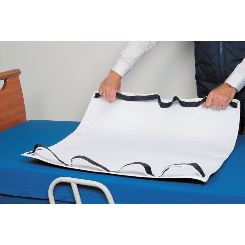 L’alèse de transfert permet de relever et retourner le patient dans son lit. En limitant les efforts, vous pouvez donner aux patients les soins plus sereinement. Tissu imperméable et absorbant avec structure innovante 4 couches hydrophobes : dessus matelassé 100% polyester avec film polyuréthane et dessous polyester pour faire glisser le patient sur le lit. Muni de 4 poignées. Convient aux patients souffrant d’incontinence. Lavage en machine à 40°C.