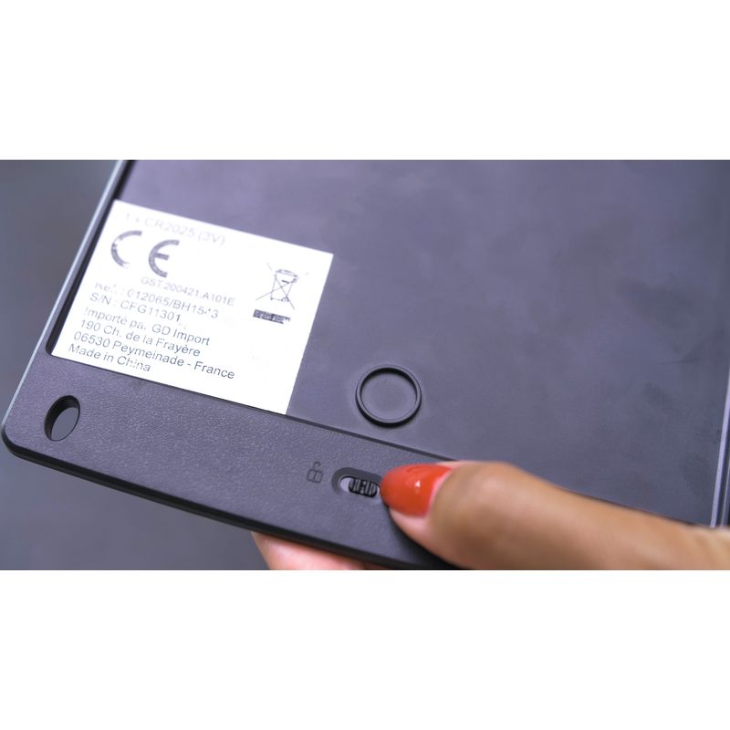 Ardoise électronique, permettant de noter tout ce qui est important pour les personnes à domicile. Avec une simple pression d’un bouton (un commutateur de sécurité permet de le garder écrit), vous effacez la page d’écriture et vous pouvez réécrire à loisir. Livré avec stylo plastique, fonctionne avec une pile bouton CR2025 fournie. Dimensions : 14,6 x 22,7 x 0,5 cm. Matériau ABS.