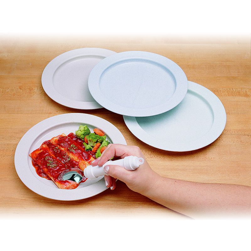 Cette assiette équipée d’un rebord plus haut et plus droit qu’une assiette classique, permet de manger d’une seule main sans faire déborder les aliments. Le dessous de l’assiette est antidérapant afin d’éviter que l’assiette ne glisse pendant le repas.