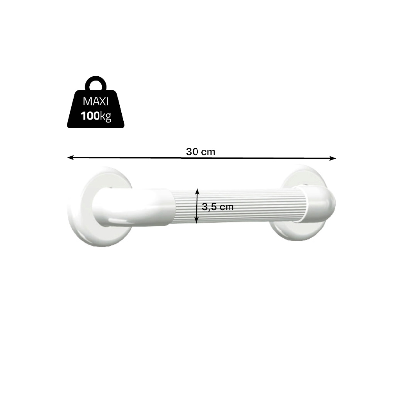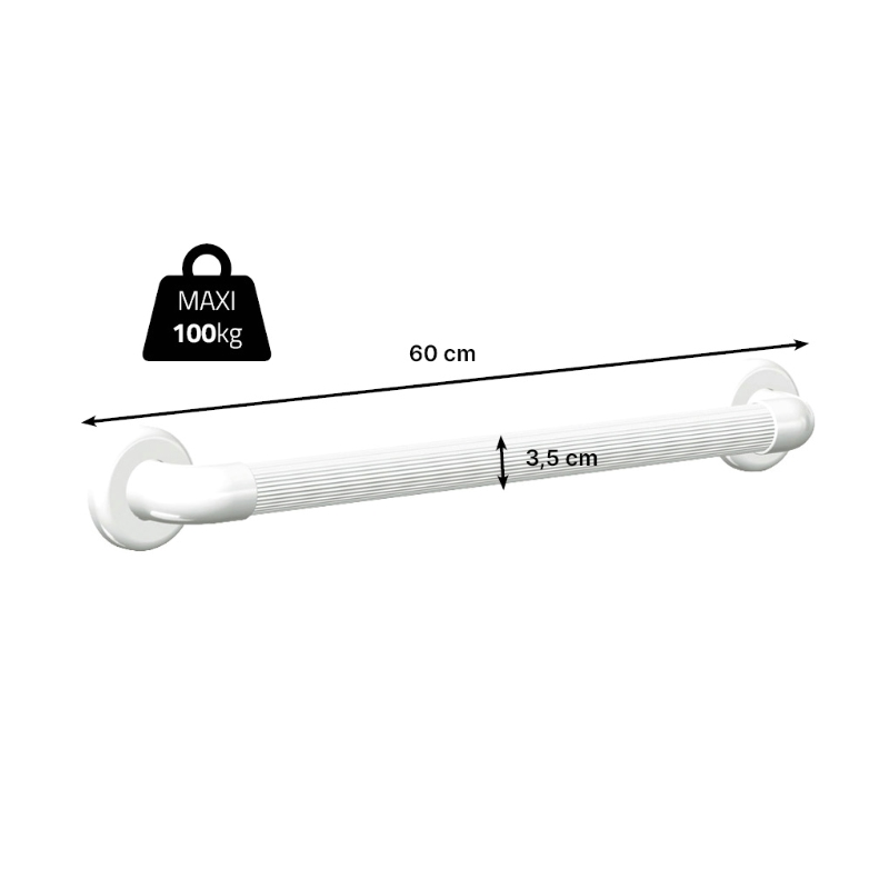 Barres d’appui à fixer au mur. Belle finition grâce aux cache-vis. Coudes en ABS et corps en PVC cannelé pour une meilleure tenue de la barre. Chevilles et vis non fournies à définir en fonction du mur support.