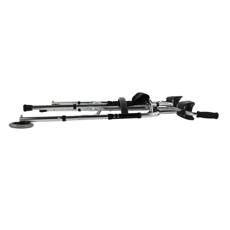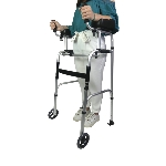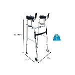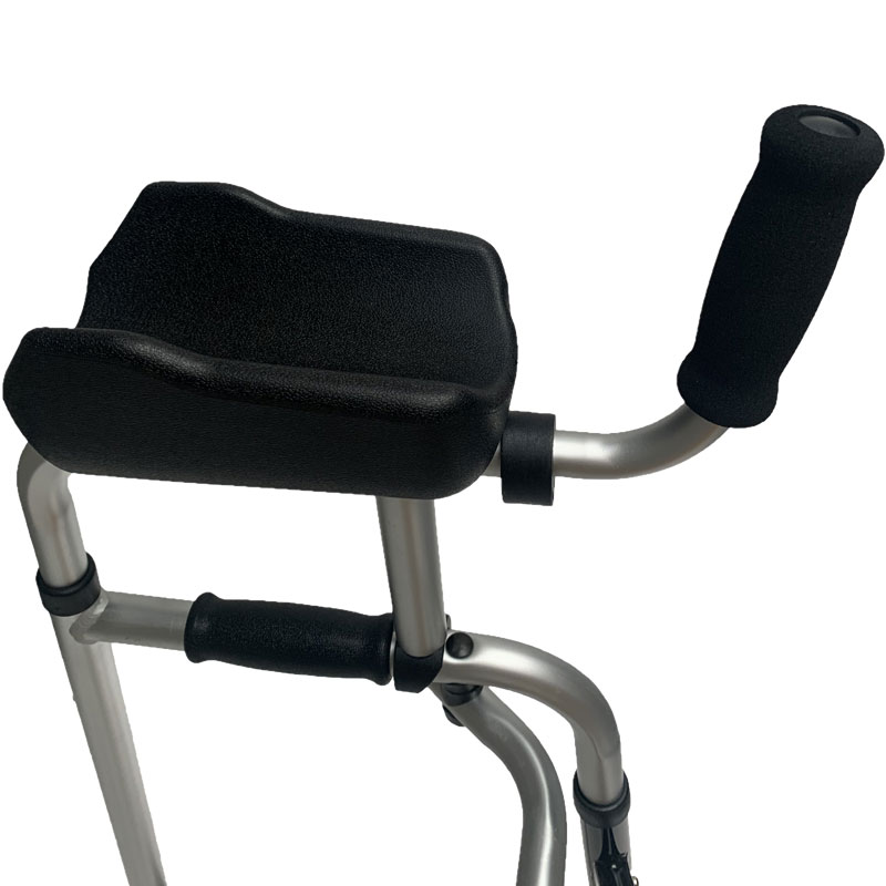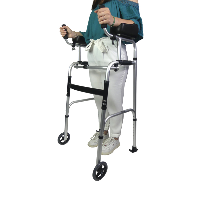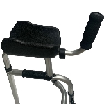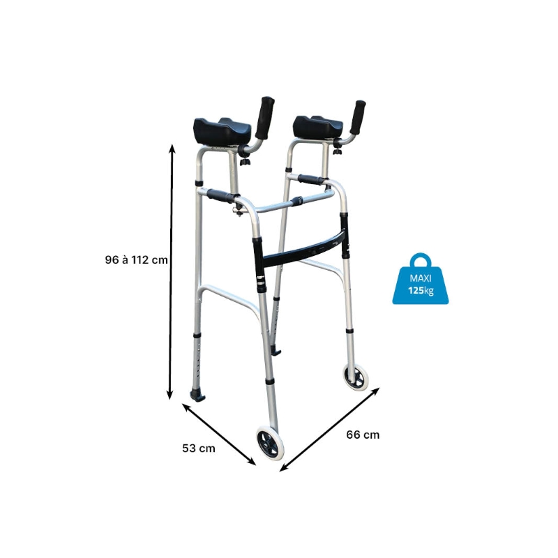 Ce cadre de marche pliant dispose de 2 roulettes à l’avant 12,5 cm et de patins glissants à l’arrière pour une déambulation linéaire mais lente. Les 2 appuis brachiaux souples permettent de s’appuyer facilement et confortablement. Les poignées sont réglables en profondeur par rapport à l’appui en 4 positions de 6 à 12 cm. Structure aluminium.