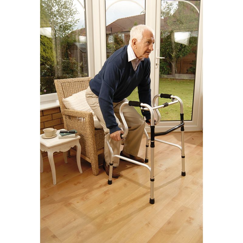 Notre cadre de marche releveur dispose de 2 poignées basses vous permettant de prendre appui lorsque vous êtes assis et vous relever plus facilement. Pliage rapide grâce au bouton rotatif situé au-milieu du cadre.
