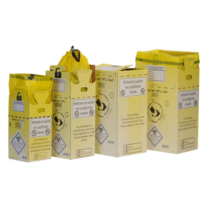 Caisse carton étanche pour déchets d’activité de soins à risques infectieux. Collecte de tous les déchets de soins à risques infectieux mous et des boîtes à aiguilles préalablement fermées. Lien coulissant de fermeture. Sac jaune Polyéthylène Haut. Système de fermeture définitive.