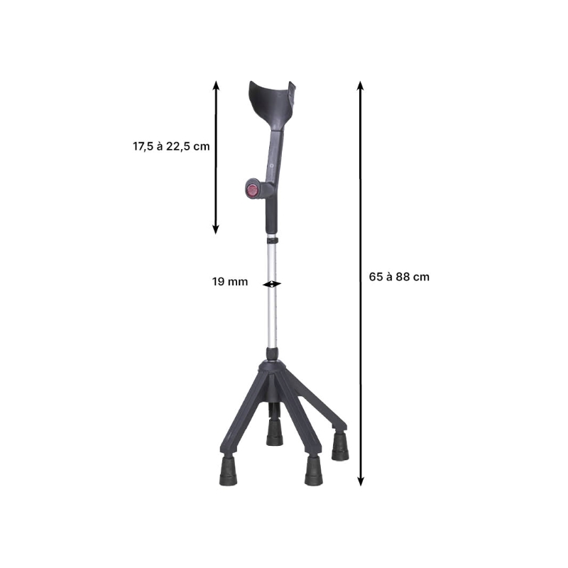 Diamètre tube 19 mm. Hauteur poignée 65 à 88 cm. Hauteur appui 17,5 à 22,5 cm.