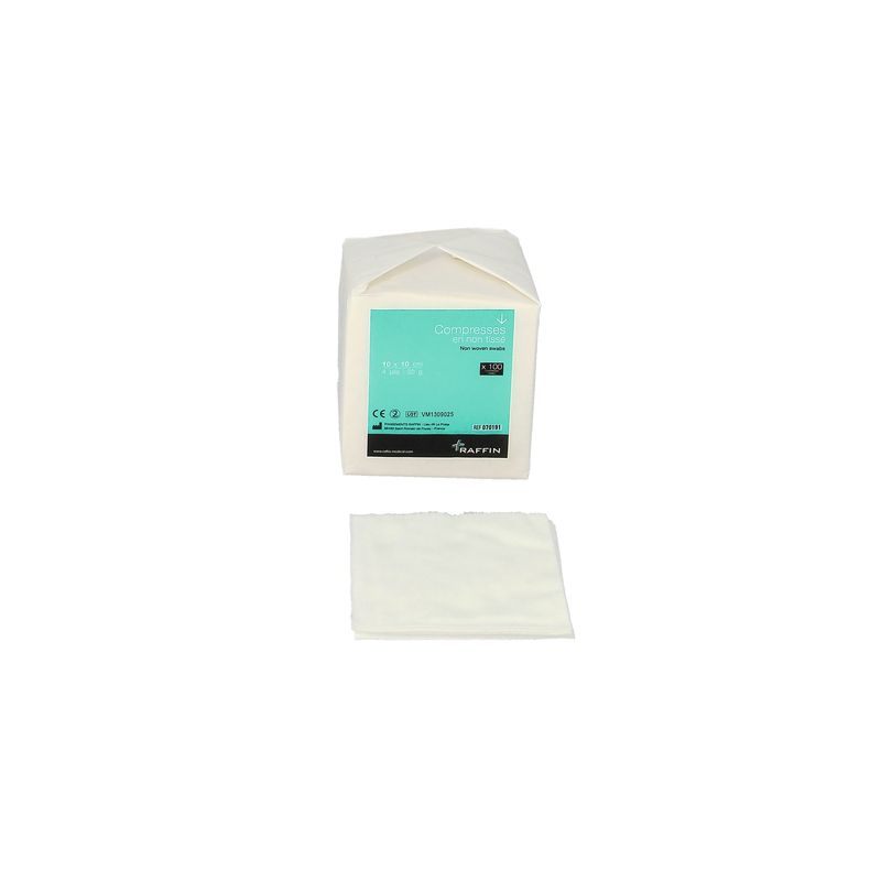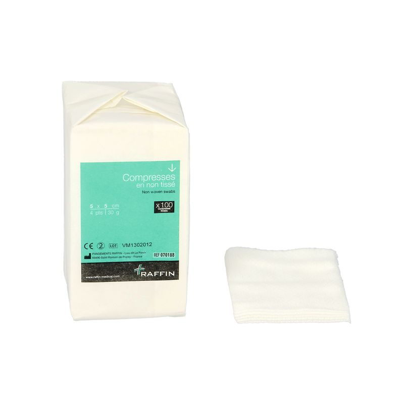 4 plis. non-stérile. Densité 30g/m². 3 formats 5x5cm, 7.5×7.5xm et 10x10cm. Lot de 100.