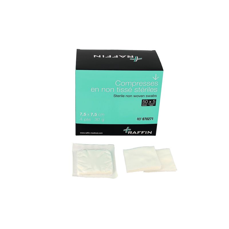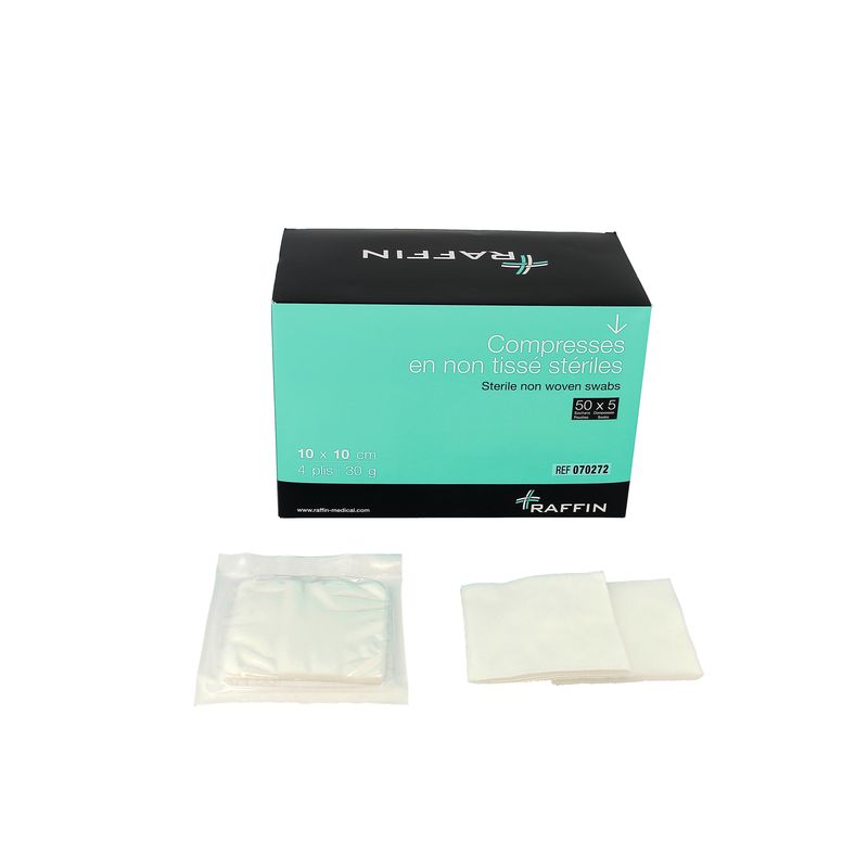Pour le nettoyage et la protection des plaies. Non-tissé 67% viscose et 33% polyester. Usage unique. 4 plis 30gr/m2.