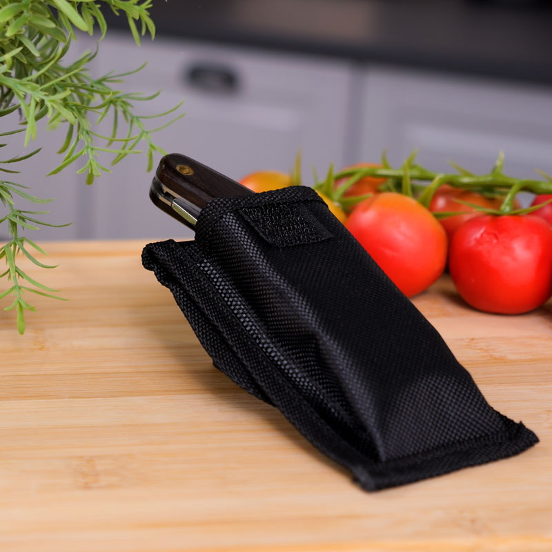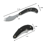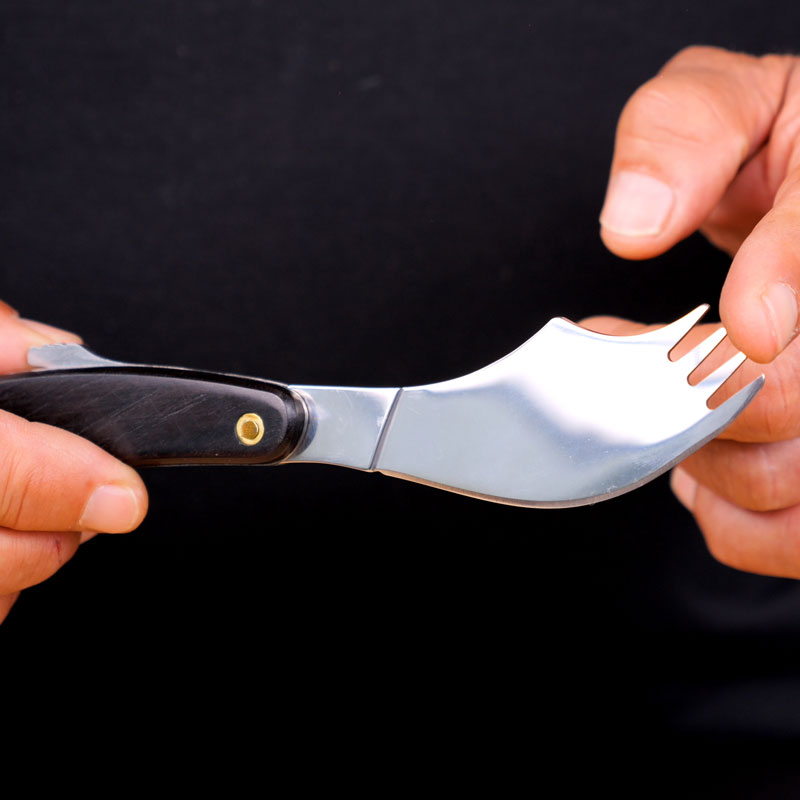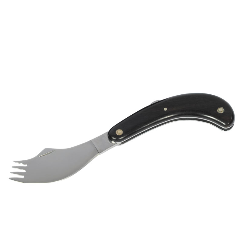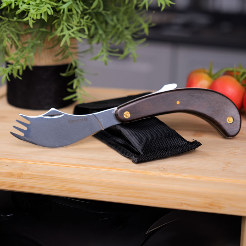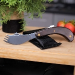 Couteau-fourchette pliant idéal pour manger d’une seule main. Il est étudié pour pouvoir s’ouvrir et se refermer avec une seule main. Lame en acier inoxydable équipée d’une extrémité type fourchette 4 piques. Manche en bois massif patiné de grande qualité. Acier inoxydable 440 aiguisable. Livré avec un étui attachable en nylon à la ceinture pratique pour le transport.