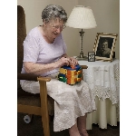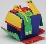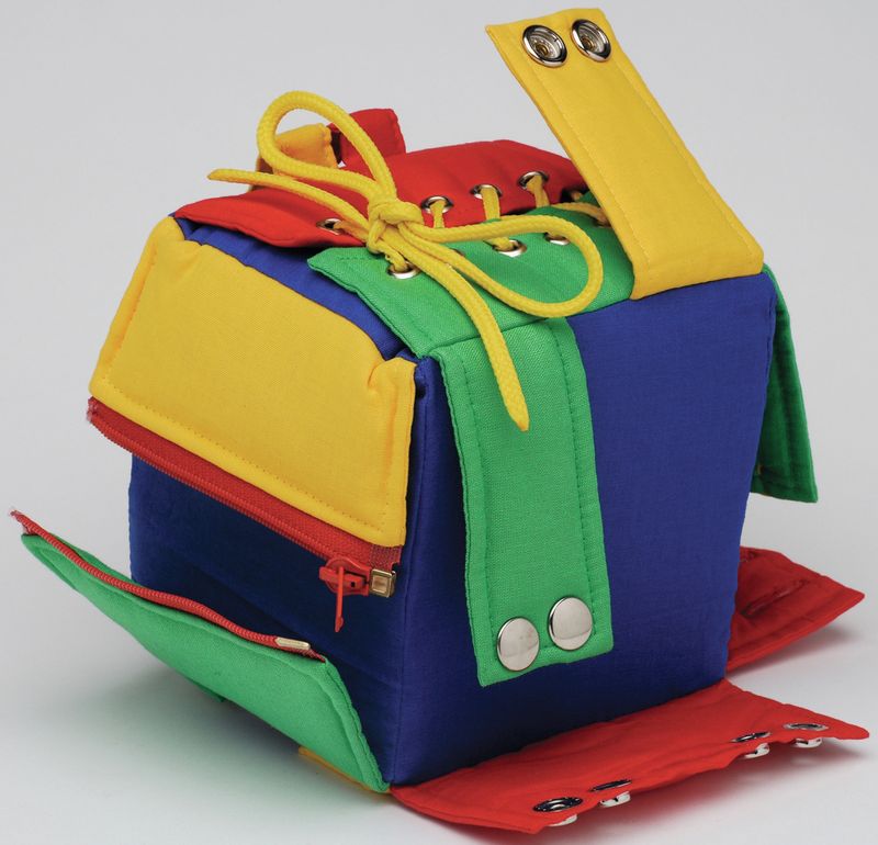 Ce cube permet de développer des aptitudes de motricité fine ou de les conserver. Sur chaque face, vous trouverez des laçages, des boucles, des pressions, toujours avec des matériaux doux au toucher.