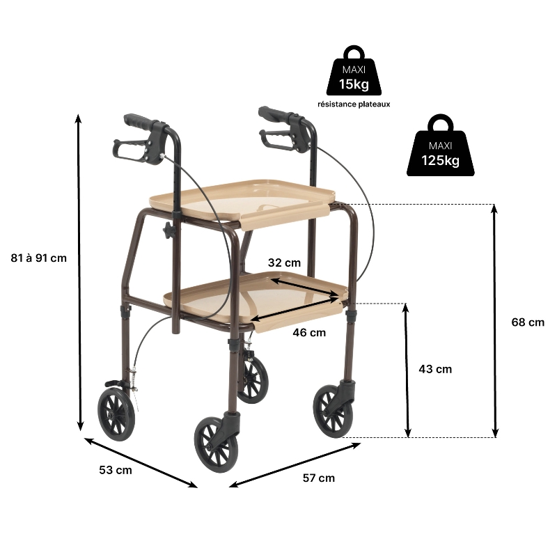 Dimensions : larg. 57 x prof. 53 x haut. poignées 81/91 cm. Hauteur plateaux 43 et 68 cm. Plateaux 46 x 32 cm.