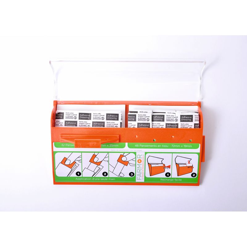 Dimensions : 180 x 110 x 30 mm. Muni d’un couvercle de protection transparent permettant de protéger efficacement les pansements de la poussière et de l’humidité. Son système de distribution permet de distribuer le pansement « prêt à l’emploi »