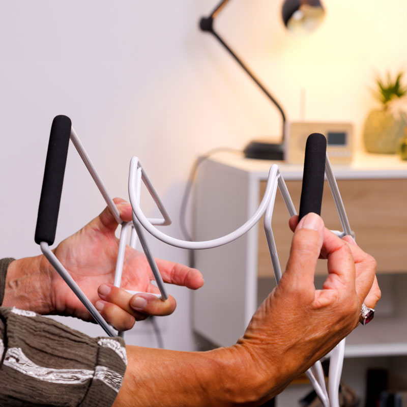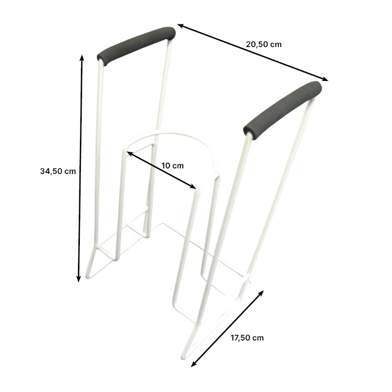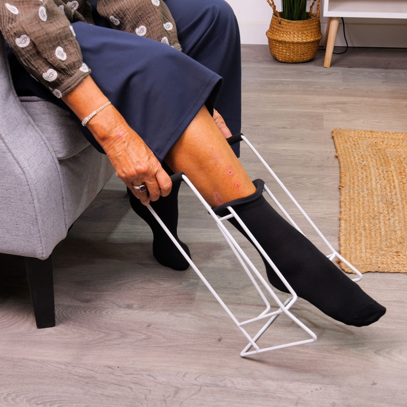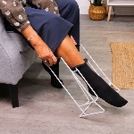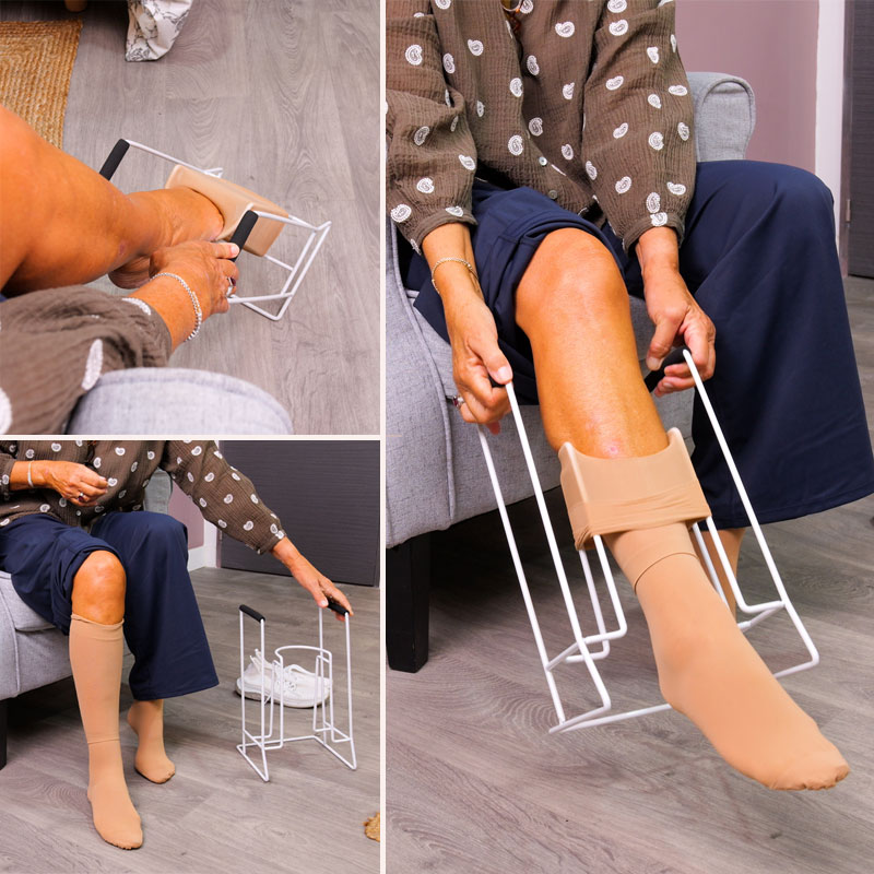 Notre enfile-bas Classic permet d’enfiler avec moins d’effort et de contorsions vos chaussettes ou bas de contention. Il suffit de l’enfiler d’abord sur le cadre métallique jusqu’au bout, d’insérer votre bout de pied et de tirer sur les poignées pour remonter l’ensemble le long de votre jambe. Cadre métallique peint époxy blanc.