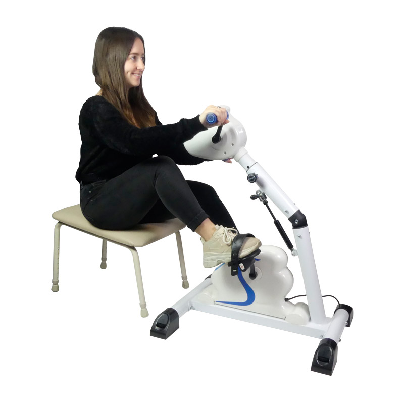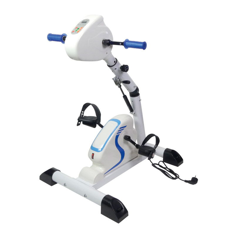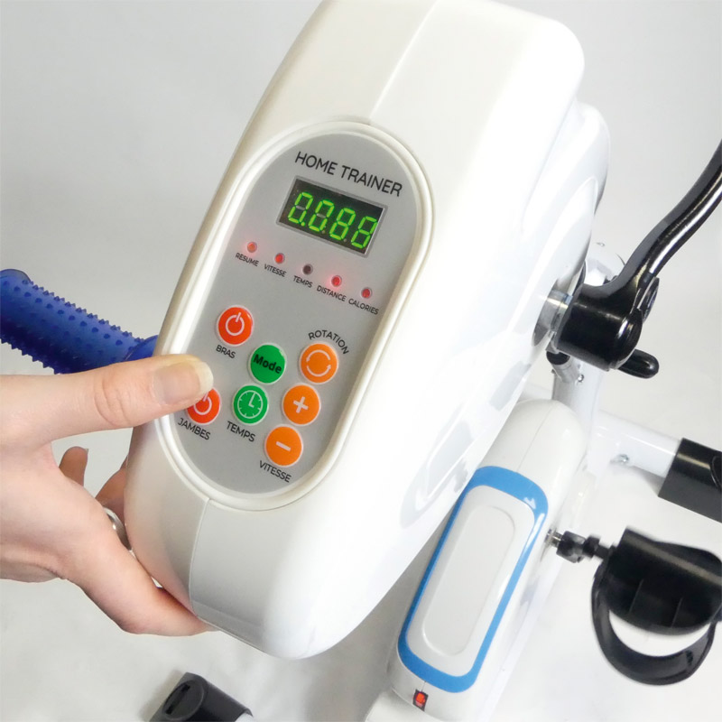 Cet entraineur permet de mobiliser les membres inférieurs et les membres supérieurs indépendamment. Bras supérieur réglable en hauteur et en écartement pour les membres supérieurs. Les poignées sont souples et à picots pour bien ressentir le mouvement. L’utilisateur peut provoquer des ralentissements en actif. Le sens d’entrainement est modifiable à tout moment. 10 intensités de vitesse. Pédales à lanières sécurisantes. Afficheur 4 fonctions : vitesse, temps, distance et calories. A brancher sur secteur.