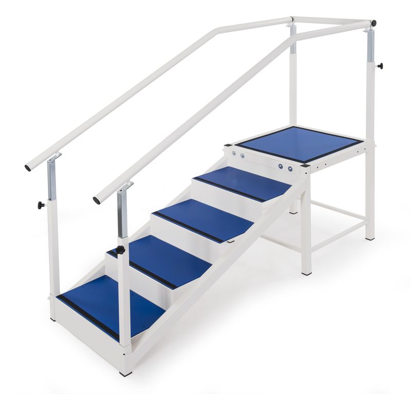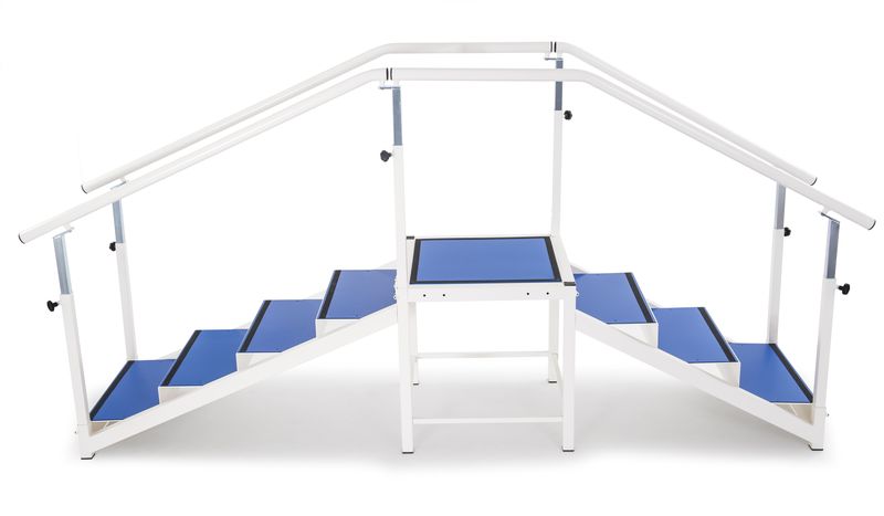 Structure en acier époxy, parties coulissantes zinguées. Mains courantes en forme anatomique en métal époxy réglables en hauteur avec un système télescopique.