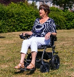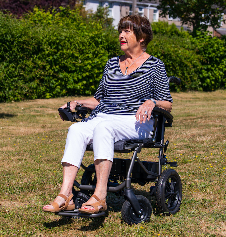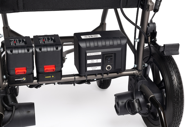 Unique : l’accompagnant peut contrôler le fauteuil grâce à une manette à côté des barres de poussée.