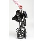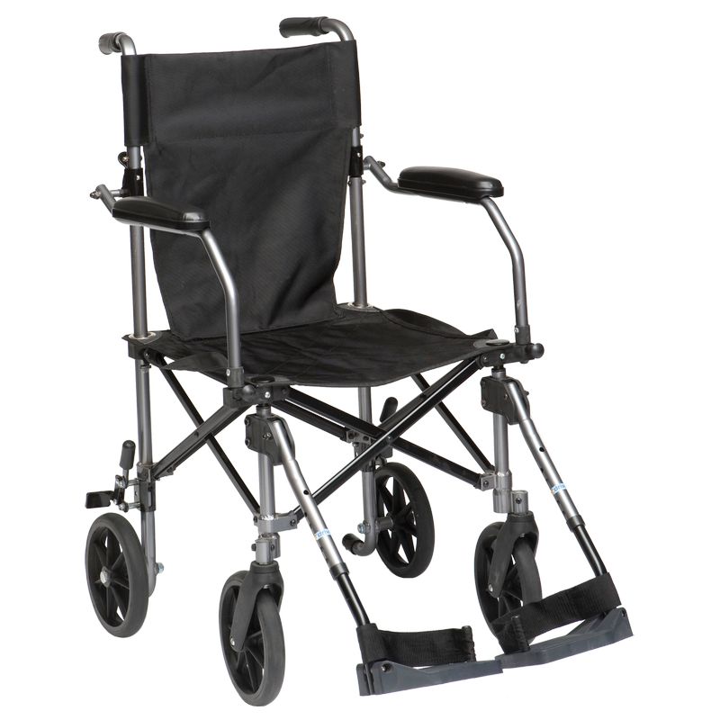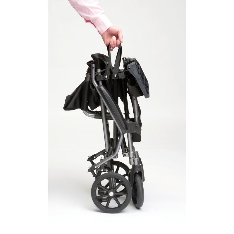 Le fauteuil de transfert Travelite se plie sur une dimension d’environ 1/3 par rapport à un fauteuil roulant standard. Idéal pour les petits déplacements. Accoudoirs capitonnés relevables. Structure aluminium.