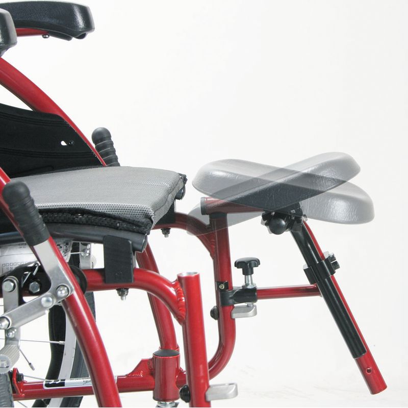 – Une structure très légère pour ce type de fauteuil, seulement 14,2 kg tout équipé en version 40 cm (14,5 kg pour le 45 cm et 14,8 kg pour le 50 cm), équipé de série de freins tierce personne à blocage réglable, d’accoudoirs relevables, de roues anti-bascule, d’accoudoirs souples et d’une main courante moulée antidérapante.