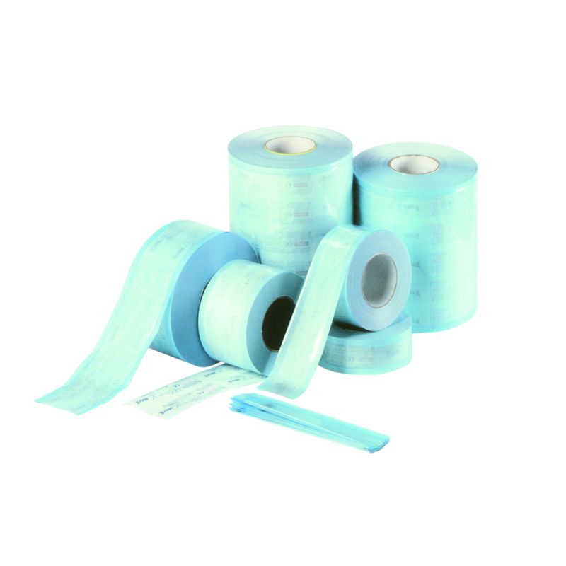 Gaine de stérilisation pour chaleur humide, fabriquée à partir d’un film polyéthylène transparent et d’une feuille de papier blanc isolant et étanche.