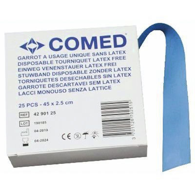 Garrot sans latex. Dim. 45 cm x 2,5 cm. Boîte distributrice de 25.