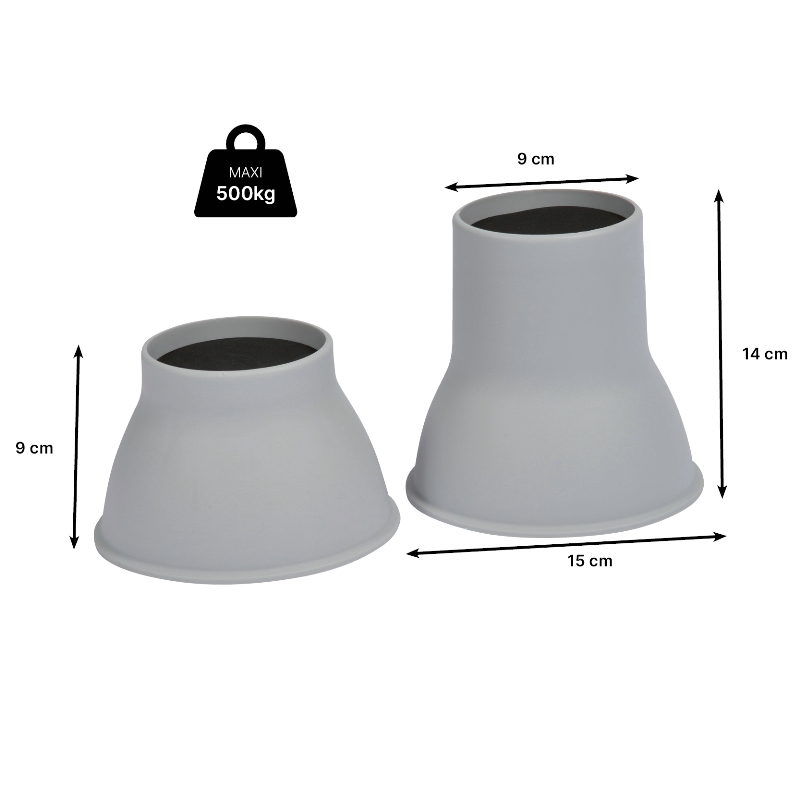 , il suffit de les disposer sous les pieds de votre chaise ou de votre lit pour augmenter leur hauteur. La partie supérieure est très large pour recevoir la plupart des pieds de meubles et un renfoncement central permet d’y positionner une roulette en toute sécurité.