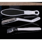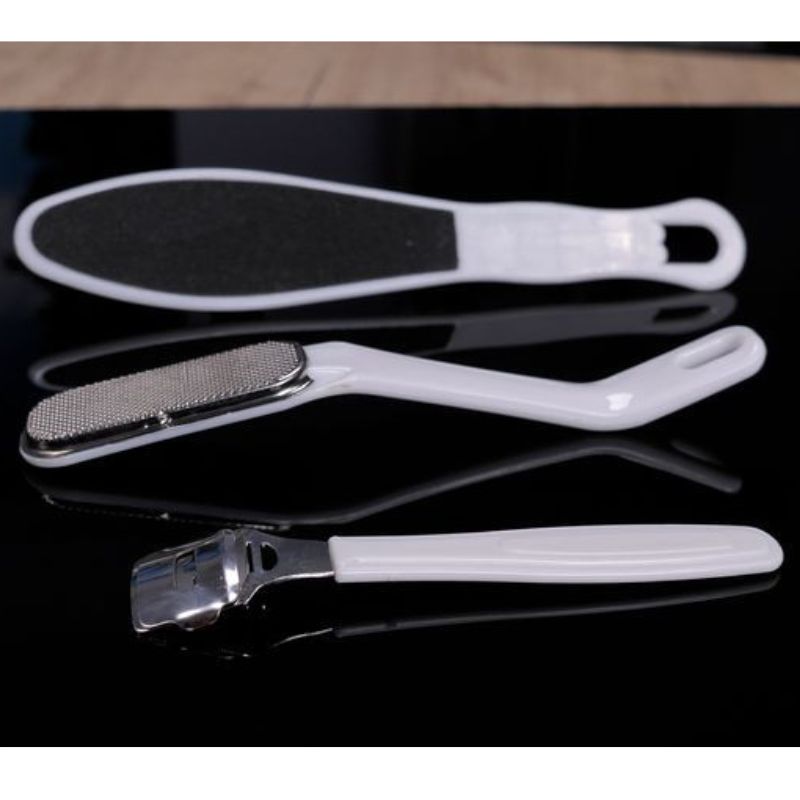 Le set comprend un coupe-corne de 14 cm, une râpe à peaux mortes gros grain en métal 19 cm et une râpe grain fin en toile émeri 22 cm pour adoucir.