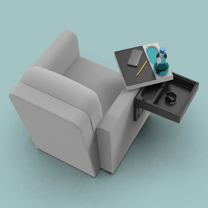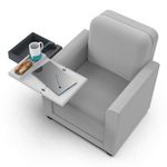 La tablette française s’installe sur la majorité des accoudoirs de canapé ou de fauteuils releveurs. Elle est très stable et permet de garder l’accoudoir libre d’utilisation. Elle se pivote très simplement et se déploie pour devenir un support pour les repas, la lecture ou l’écriture. Muni d’un espace rangement, d’un porte-gobelet et d’une prise USB intégrée.