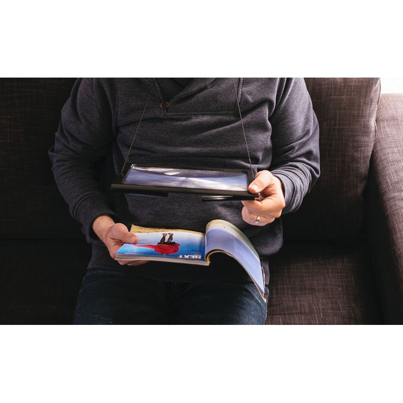 Cette large loupe dispose de pieds repliables d’une hauteur de 10 cm pour pouvoir lire facilement sur une table. Elle peut également se suspendre autour du cou grâce au cordon fourni, pour travailler en gardant les mains libres. PVC noir. Dimensions : 23 x 16 cm. Poids 240 gr. Grossissement x2.