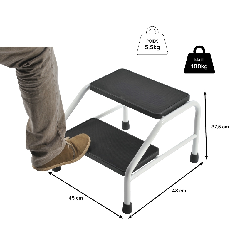 Marches à plateaux coins arrondis, noyau bois revêtu caoutchouc antidérapant. Structure renforcée en acier époxy blanc.