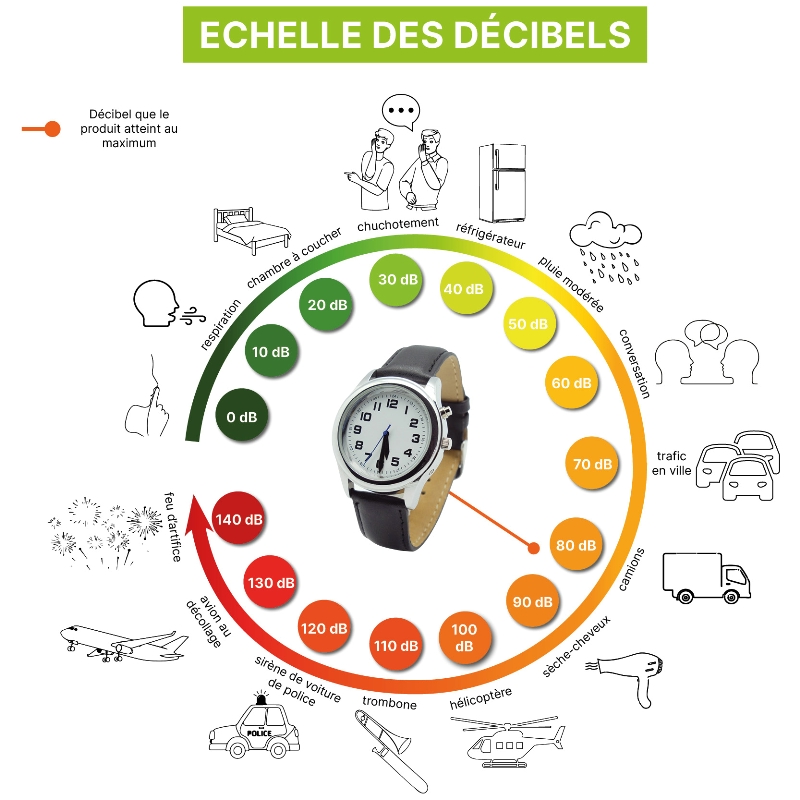avec bracelet imitation cuir et cadran verre. Fonction vocale de qualité avec voix féminine claire et distincte 84 dB.