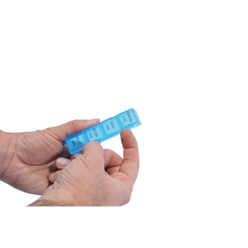 Ce pilulier semainier est un organiseur contenant une boite transparente pour chaque jour de la semaine contenant elle-même 4 compartiments pour la journée complète. Idéal pour préparer à l’avance les traitements et toutes vos prises de médicaments. Ce semainier est protégé dans une pochette refermable compacte et passe-partout.