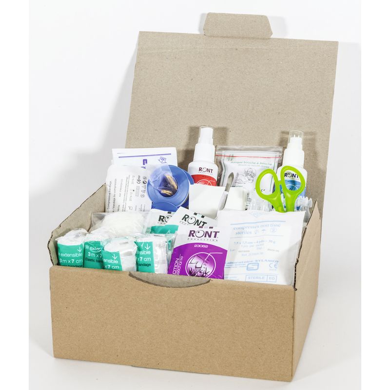 Composition : 1 couverture de survie, 22 pansements adhésifs assortis, 1 pansement compressif stérile, 10 compresses stériles 20x20cm, 1 bande extensible 3mx5cm, 1 bande extensible 3mx10cm, 1 rouleau de sparadrap sécable 2cmx5m, 1 paire de ciseaux à bouts ronds, 1 pince à échardes à mors plats, 1 paire de gants jetables, 4 compresses nettoyantes à la Chlorhexidine, 4 compresses d’alcool à 70°, 4 compresses anti-coups au calendula, 4 compresses de lotion asséchante, 2 dosettes de sérum physiologique stérile, 1 lot de 2 tampons hémostatiques pour le nez et 1 livret de premiers soins.