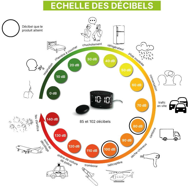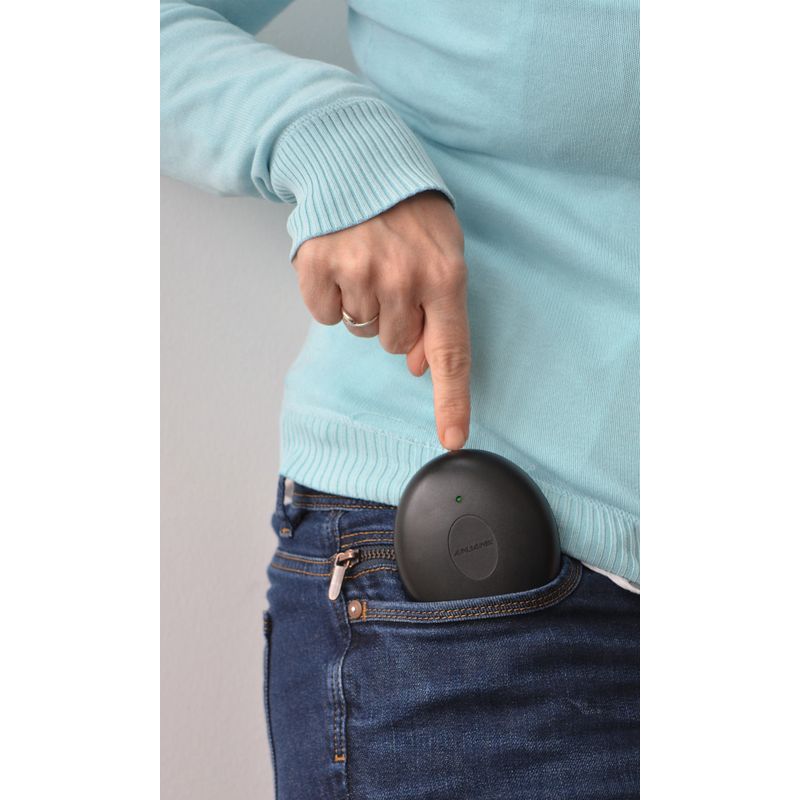 Vibreur sans fil, à 3 niveaux d’intensité, pouvant être placé près du lit ou glissé facilement dans une poche. Sonnerie réglable (85 et 102 dB). Mode vibreur/sonnerie. Boutons et molette ergonomiques.