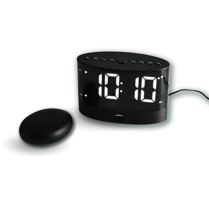Dimensions réveil : 15,5 x 6,5 x 10 cm – Vibreur : 7,5 x 9 cm.