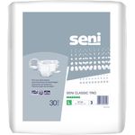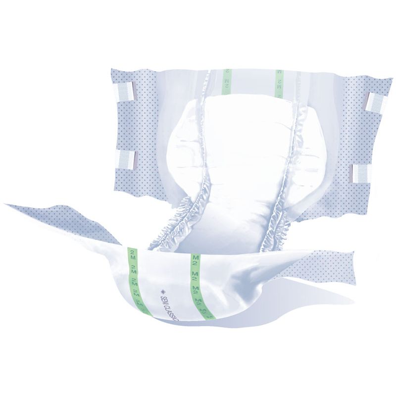 Seni Classic propose une gamme de changes complets modèle CLASSIC TRIO destinées aux personnes souffrant d’incontinence urinaire et fécale très forte. Composé de deux coussins absorbants de forme anatomique en pulpe de cellulose avec super-absorbant. Voile de distribution (EDS). Tout le long du coussin absorbant, des barrières latérales avec fil élastomère sont dirigiées vers l’extérieur permettant à la zone inguinale d’être protégée faces aux fuites. Quatre attaches vélcro multi-repositionnables. Double indicateur d’humidité : impressions à l’encre qui deviennent floue et deux bandes en colle jaune qui deviennent vertes lorsque la protection est souillée. Couche extérieure perméable à la vapeur dans la partie centrale et non-tissé sur les côtés (hanches).