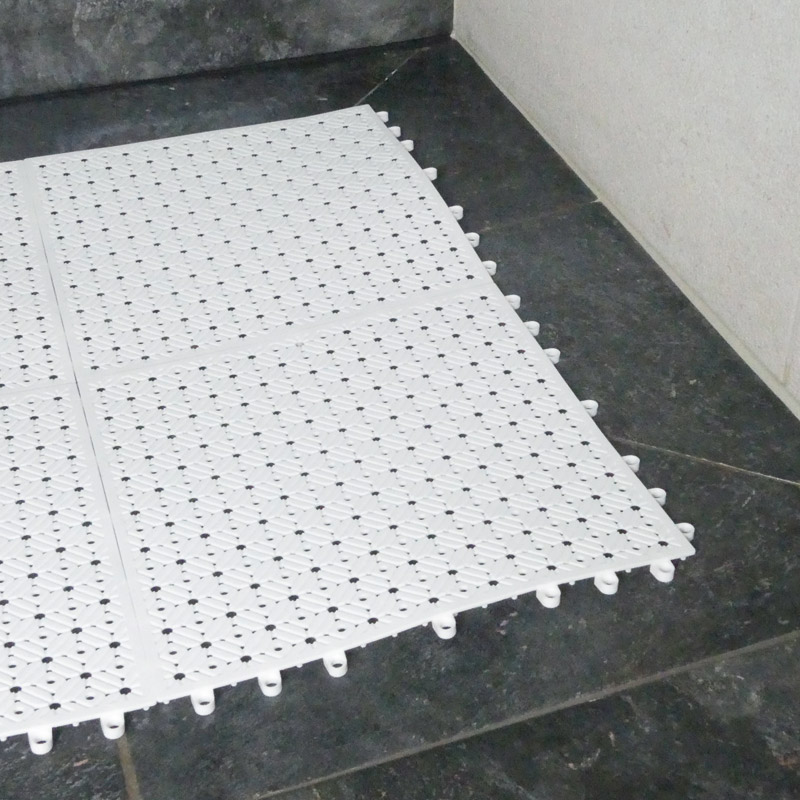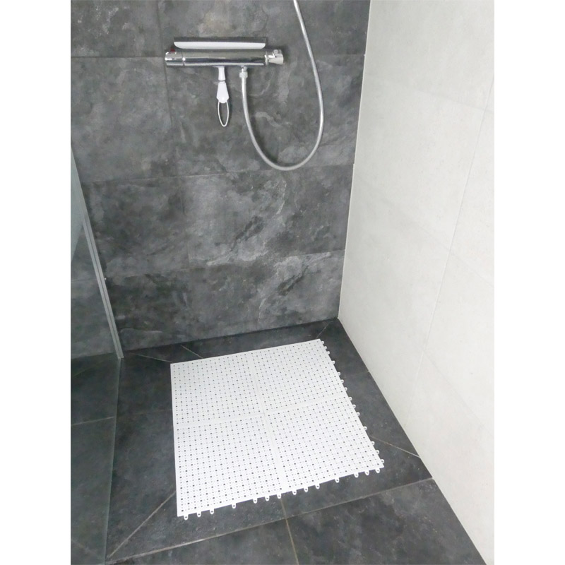 Le set est composé de 4 dalles solidarisables par clip. Elles permettent de rendre antidérapant votre cabine de douche, tout en surélevant vos pieds du fond. Chaque dalle fait 30 x 30 cm, les 4 dalles solidarisées en carré représentent 60 x 60 cm. Possibilité de solidariser 2 sets ensemble pour les douches plus grandes.