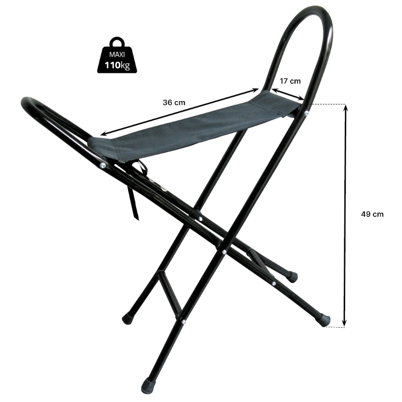 Ce petit siège est pliable, facile à transporter et comprend une assise en tissu confortable. Il est muni d’une poignée pour le transporter pendant la marche en position pliée. Structure acier coloris noir.