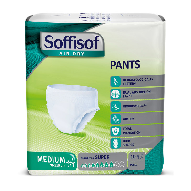 Soffisof pants offer a comfortable, discreet solution for managing incontinence on a daily basis. With their high absorption capacity and anti-leakage barriers, they guarantee reliable protection in any situation. Easy to put on and hypoallergenic, they are ideal for sensitive skin. Soffisof ensures freedom of movement and peace of mind at all times.