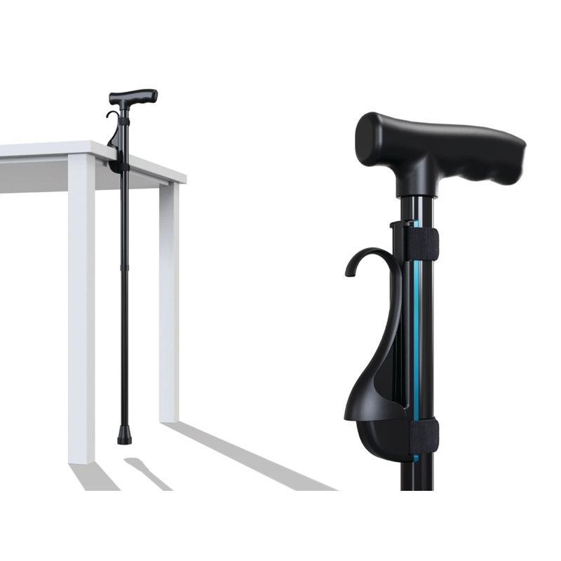 Son clip à ressort permet de poser fermement la canne sur les bords de table, et son crochet permet de la suspendre.