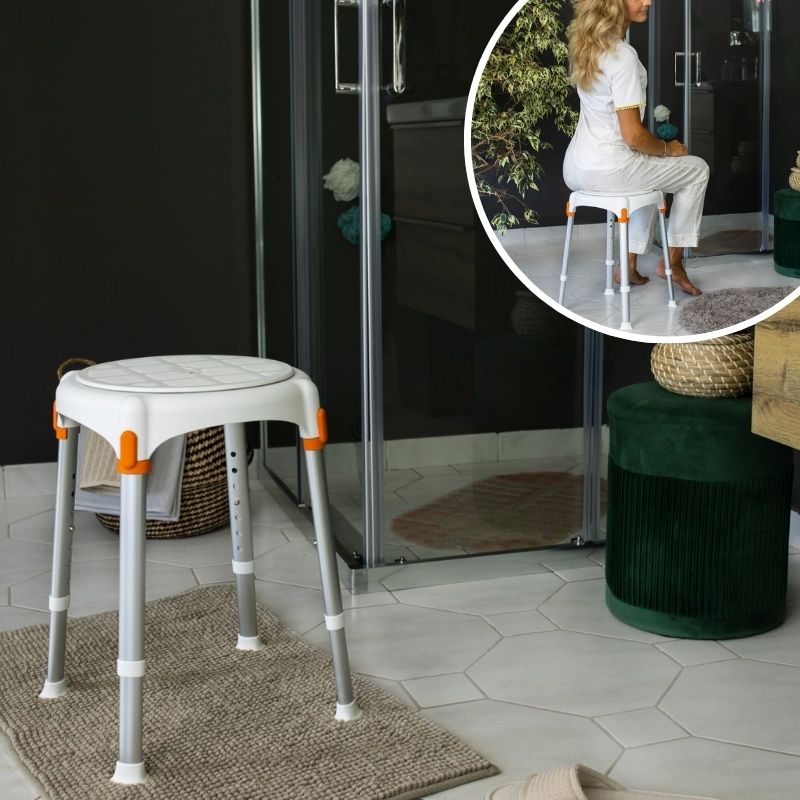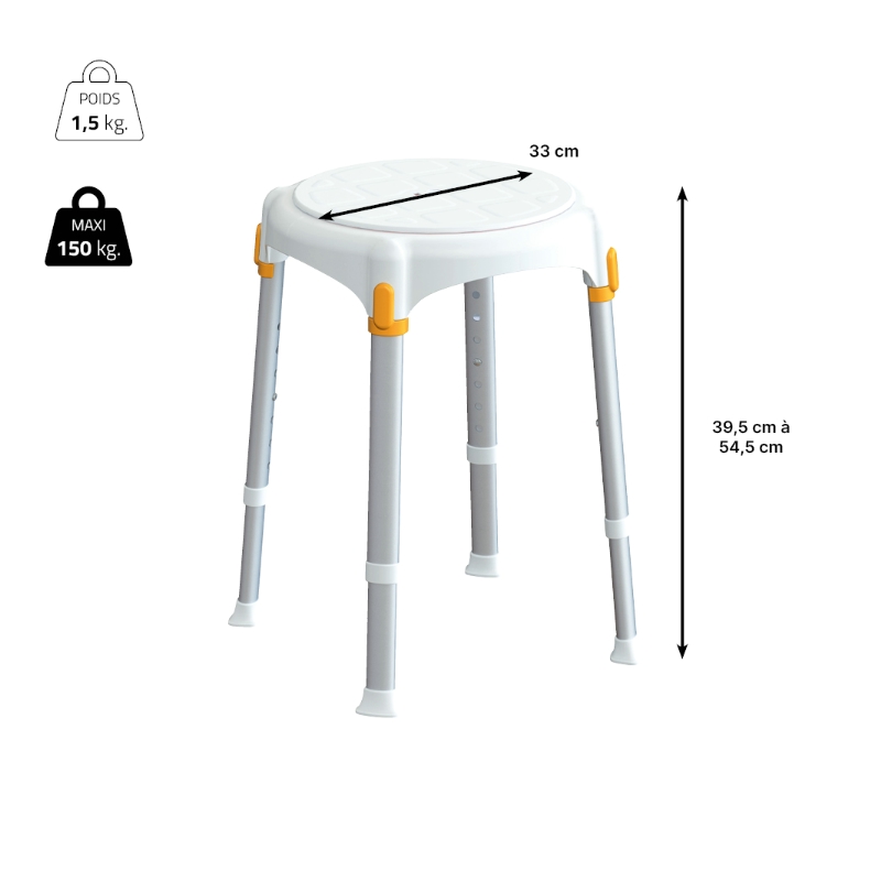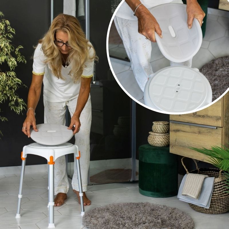 Grâce à son assise pivotante à 360°, se positionner devant la robinetterie et sortir de la cabine de douche est plus facile. Assise pivotante amovible pour le nettoyage. Très facile à régler en hauteur.