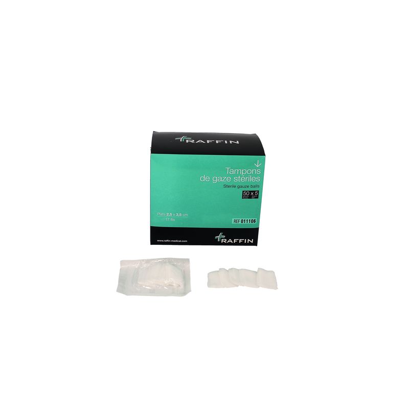 Produit naturel en gaze de coton 20 fils. Conditionnement par 5 tampons stériles.