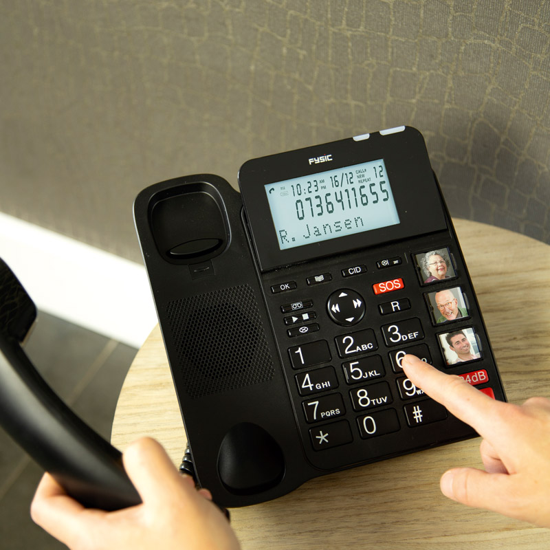 Téléphone filaire avec émetteur d’alarme SOS sans fil, avec répondeur intégré, grand écran rétroéclairé et visualisation lumineuse des appels entrants. 3 touches d’appel avec photos, clavier XXL, volume de la sonnerie amplifiée (+24dB). Fonction ,mains libres. Mémoire 50 contacts. Le bouton d’urgence SOS sans fil permet appels et réception mains libres et 2 touches d’appels directs, portée 50 m. Station de chargement, cordon tour de cou et clip ceinture inclus. Téléphone fonctionnant sur adaptateur (inclus).