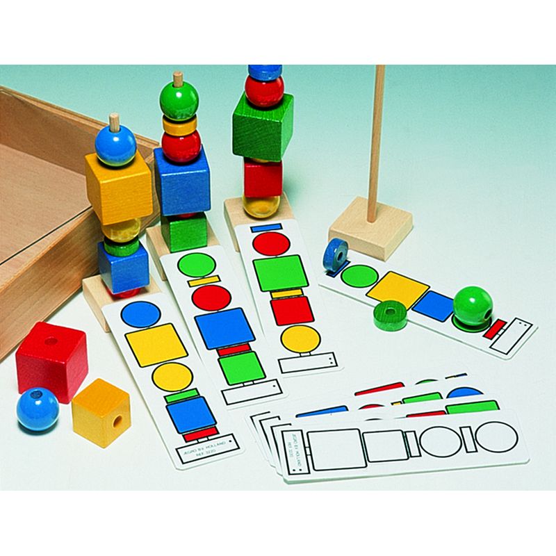 Lot de pièces en bois de formes et coloris différents à ranger verticalement en fonction d’un modèle.