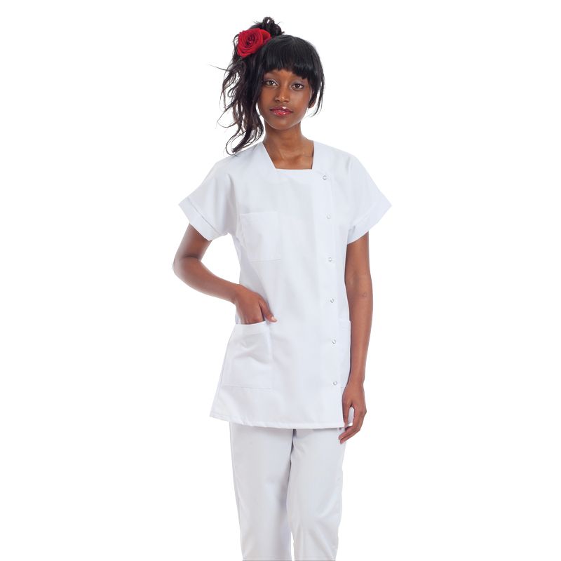 Encolure trapèze. Fermeture latérale 6 pressions. Manches courtes kimono avec revers, 3 poches. Haut. 80 cm. Sergé uni blanc 65 % polyester 35 % coton. 210 g/m2.