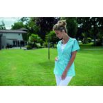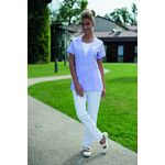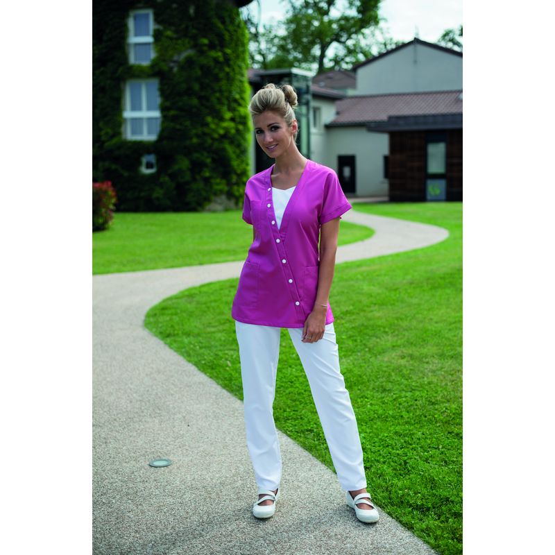 Fermeture en biais par pressions calottées. Encolure en V avec plastron, effet sur tee-shirt. Manches courtes kimono. 3 poches. Fentes latérales. Ht 75 cm.