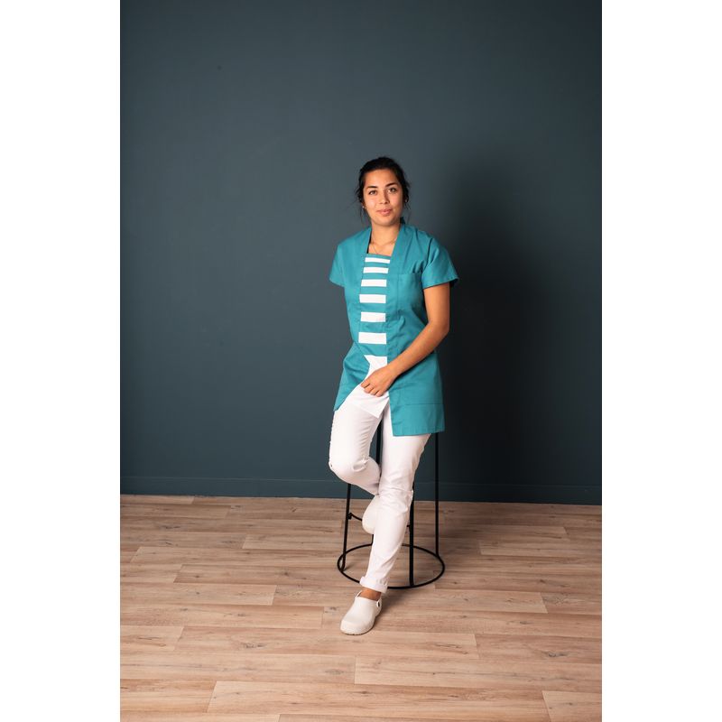 Encolure trapèze, manches courtes kimono. 3 poches, plastron fixe rayé. Fermeture latérale par 7 pressions inox cachées. Ht 80 cm.