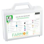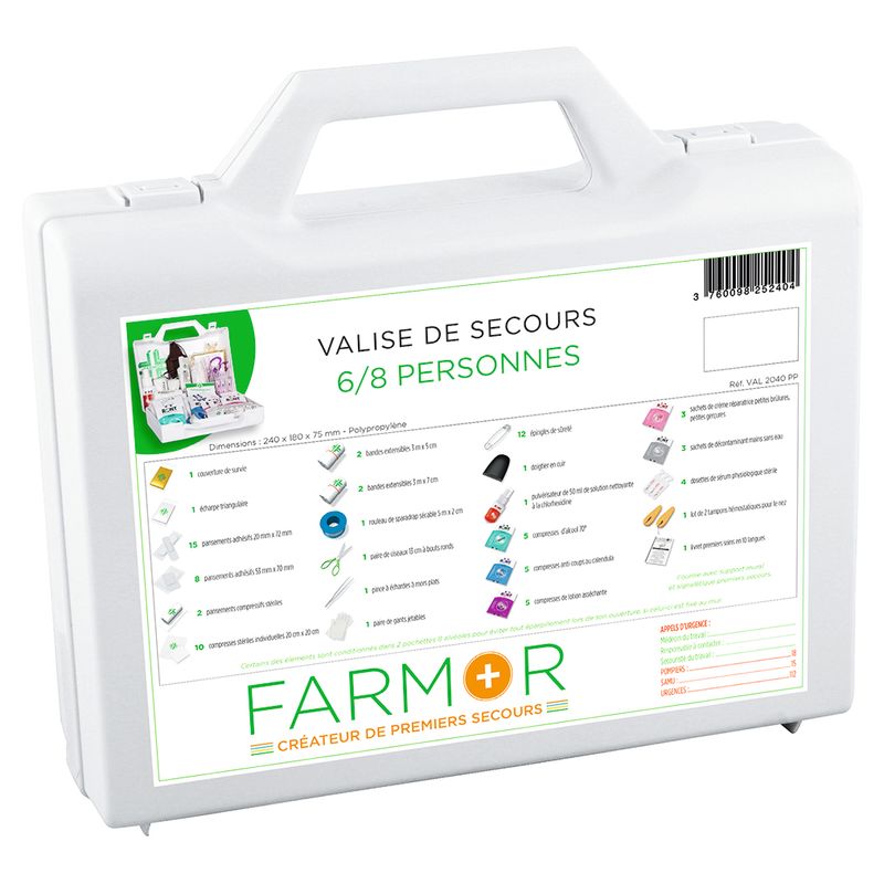 Composition : 1 couverture de survie, 1 écharpe triangulaire, 15 pansements adhésifs 20x72mm, 8 pansements adhésifs 53x70mm, 2 pansements compressifs stériles, 10 compresses stériles individuelles 20x20cm, 2 bandes extensibles de 3mx5cm, 2 bandes extensibles de 3mx7cm, 1 rouleau de sparadrap 5mx2cm, 1 paire de ciseaux 13cm à bouts ronds, 1 pince à échardes à mors plats, 1 paire de gants jetables, 12 épingles de sûreté, 1 doigtier en cuir, 1 pulvérisateur de 50 ml de solution nettoyante à la chlorhexidine, 5 compresses d’alcool à 70°, 5 compresses anti-coups au calendula, 5 compresses de lotion asséchante, 3 sachets de crème réparatrice petites brûlures, petites gerçures, 3 sachets de gel décontaminant mains sans eau, 4 dosettes de sérum physiologique stérile, 1 lot de 2 tampons hémostatiques pour le nez et 1 livret premiers soins.